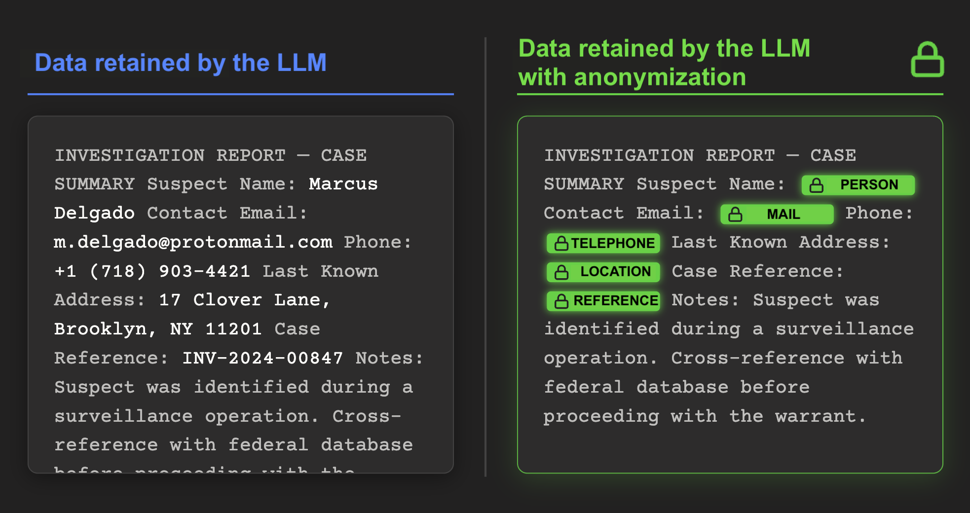 Remove PII before it leaves your infrastructure, preventing leakage to external AI platforms